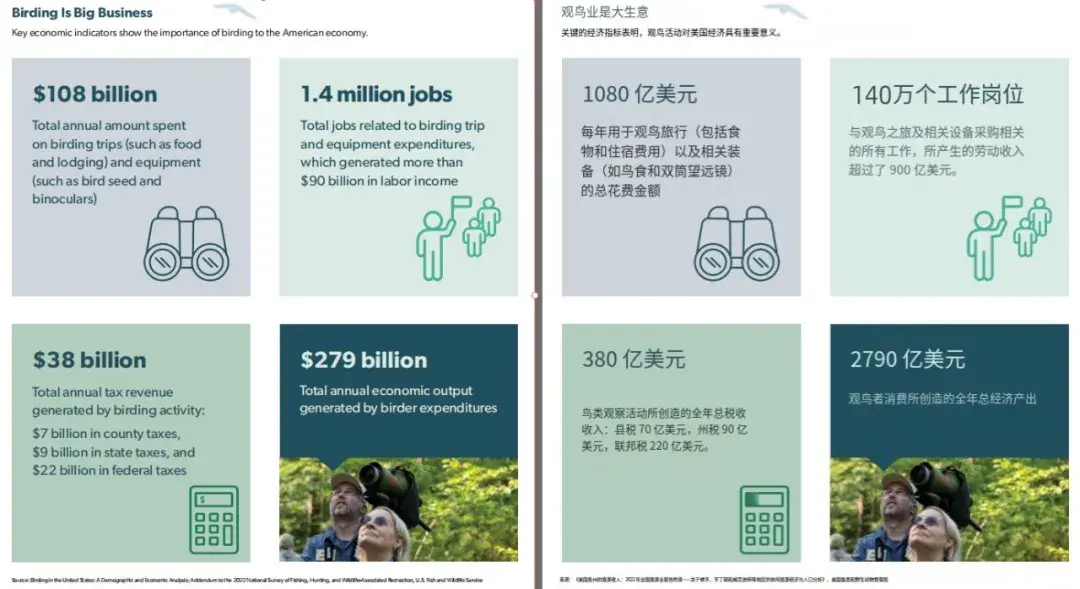 观鸟经济在全球范围内已是一个庞大而完备的产业链。数据显示,2018年,美国有4500万人的观鸟市场,为经济做出的贡献达到1070亿美元,三分之一的美国人从事观鸟活动。这一数据为中国观鸟经济的发展提供了想象空间。