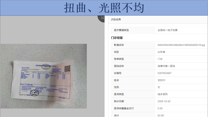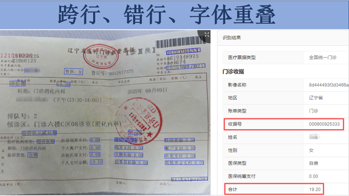 票据版式不统一:医疗票据版式全国不统一,且常包含复杂的异形表格或无线表格,关键信息定位困难。