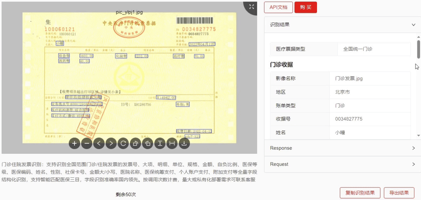 全面覆盖门诊发票、住院发票、医疗费用结算单、医疗费用明细、病历、出院小结等30+票据类型,无需分地区调用接口,泛化性强。