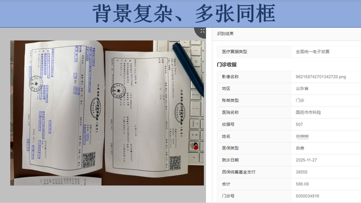 面对混贴多张票据的图像,产品可自动判断单据类型和地区,清晰切边提取信息。例如,住院发票、门诊发票等都能智能归类,提升前端分拣效率。